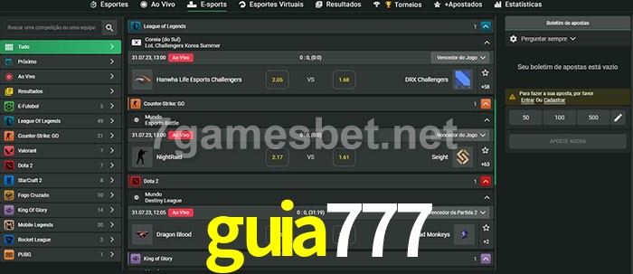 O guia777 oferece uma grande seleção de opções de apostas em e-sports com probabilidades competitivas